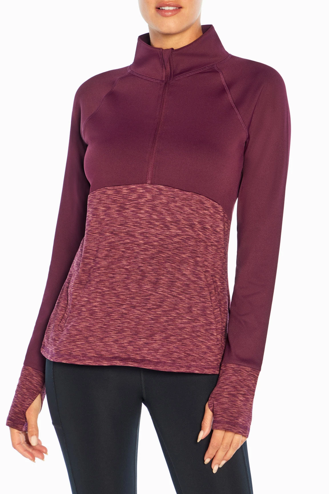 Stylish and functional, this soft and cozy pullover features a partial zip-front design with funnel neck, front slanted welt pockets, and long raglan sleeves with thumbholes.