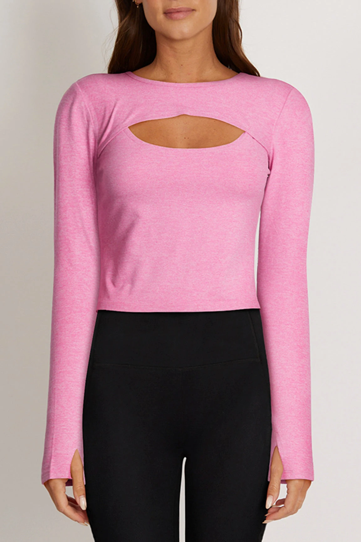 At the junction of fashion and function is this active top cut from heathered mélange jersey – brushed inside and out for superior comfort, with a classic crew neckline, a keyhole cut-out over the chest, and thumbholes to keep the long sleeves in place.